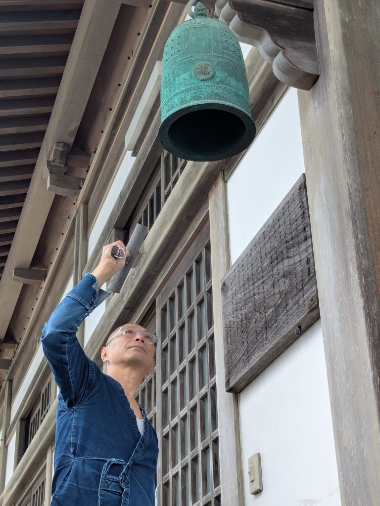 市の有形文化財でもあるその喚鐘は1769年にお寺のご先祖様が山鹿五兵衛の芦屋釜に依頼して鋳造されたものです。戦争中金属供出の要請を受け、一度は八幡製鉄所へ送られます。その後お寺は福岡大空襲で大変な被害を受けてしまいますが奇しくも喚鐘は溶解寸前、終戦となります。その後たまたま別のお寺の方が購入され、使用されていましたが近年になって譲渡を受けることとなり、栄昌寺が現在の地への移転する際にあらためて寄進されたそうです。