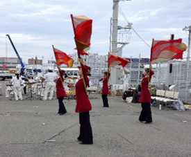 私達約100名と博多ポートタワーマスコットのポートくん、福岡市消防音楽隊の演奏、カラーガード隊のパフォーマンスとともに賑やかにお見送りです。手を振ると、乗客の方々(大きな手?)もデッキから振り返してくれました。やがて飛鳥Ⅲは優雅に岸壁から離れ、汽笛を鳴らして出航していきました。