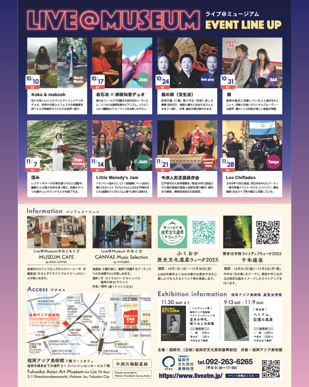 福岡アジア美術館7階のアートカフェで開催されている『Live@Museum』の10月11月のラインナップをご紹介します♪