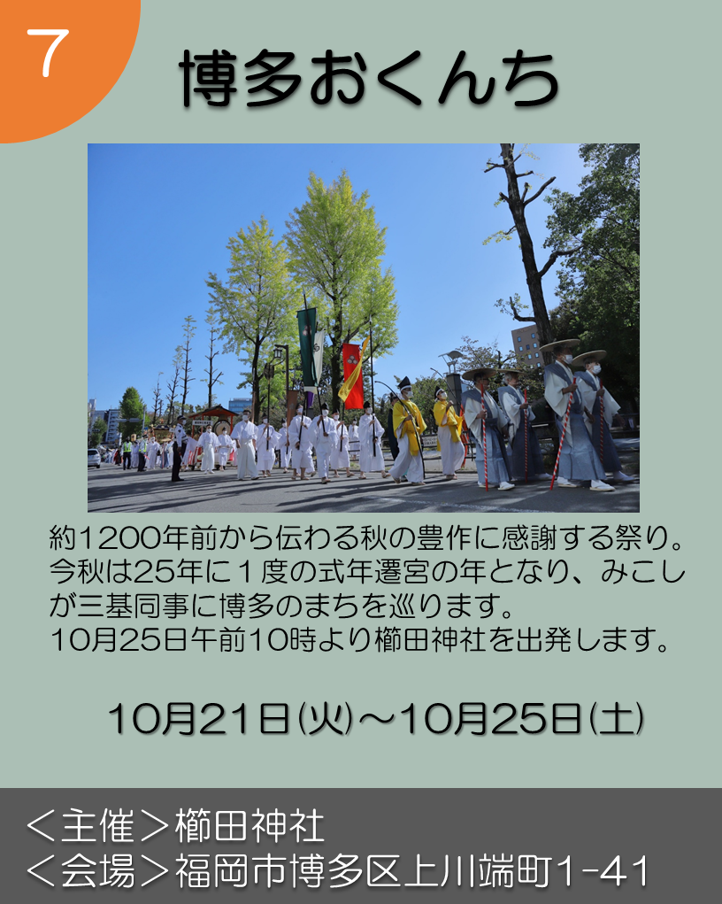 9月から11月にかけて開催される、お祭りやイベントを『博多秋博』として紹介しています!見て、聞いて、参加して、ぜひ秋の博多にお越しください♪