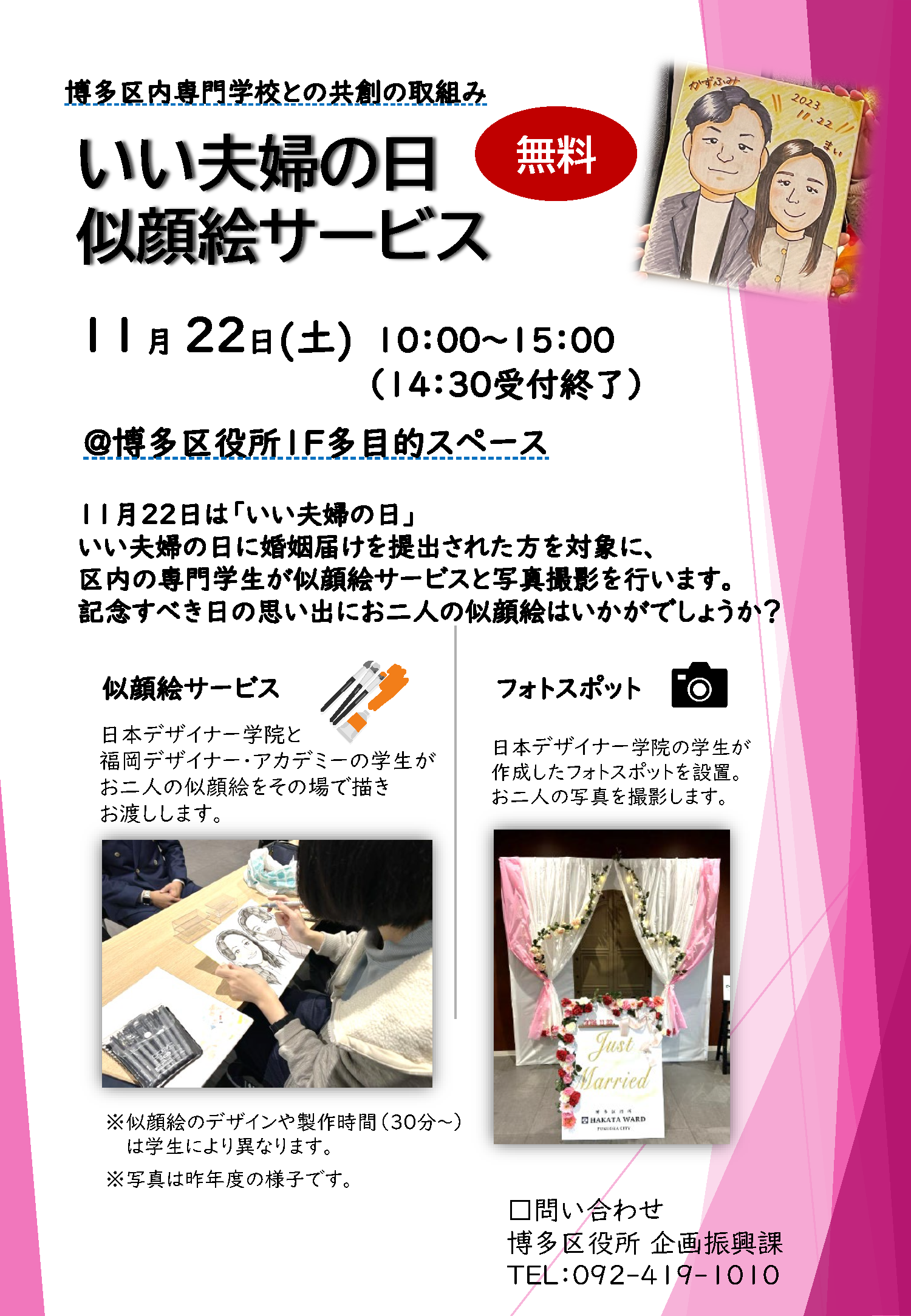 11月22日(土) 『いい夫婦の日』に、博多区役所1階の多目的スペースで、婚姻届を提出された方を対象に、無料で博多区内の専門学生が似顔絵サービスと写真撮影を行います!