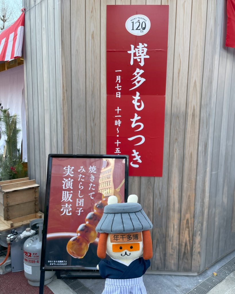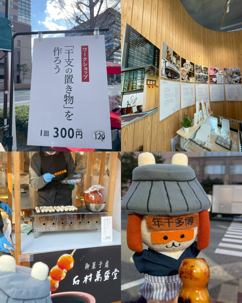 つきたてのおもちのふるまいのほかにもみたらし団子の実演販売やワークショップ、120周年パネル展も開催されていて、楽しい1年の始まりになったんだもん!